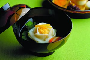 目白の椿山荘70周年記念に行われた料亭錦水の日本酒”久保田”とのコラボレーションイベント「KUBOTAアフタヌーンティー」に採用され、椀物として提供されました。その他、最高級おせちに「椿蒲鉾」として彩りを添えました。職人をホテルに派遣し、現地で製造を行いました。